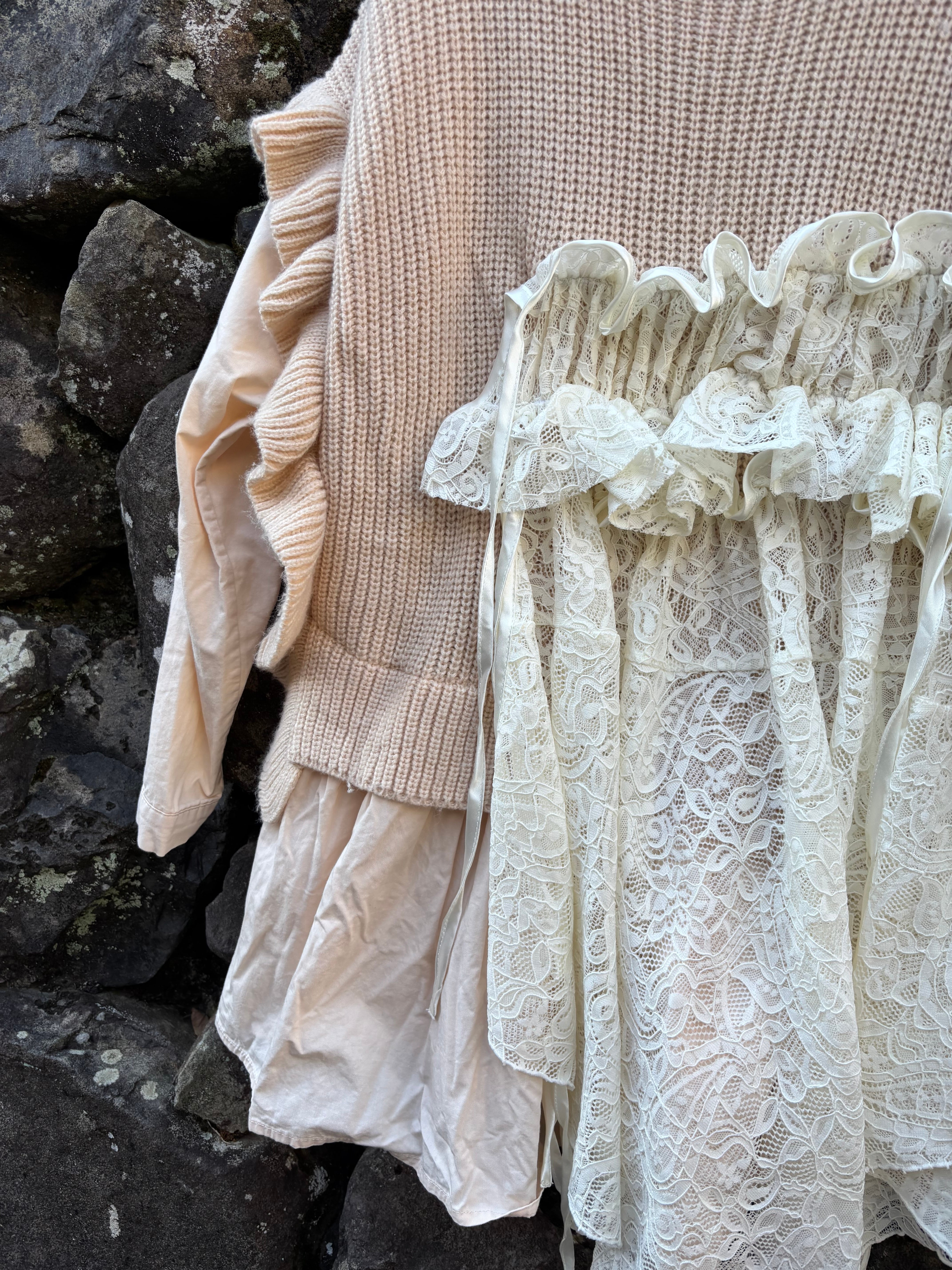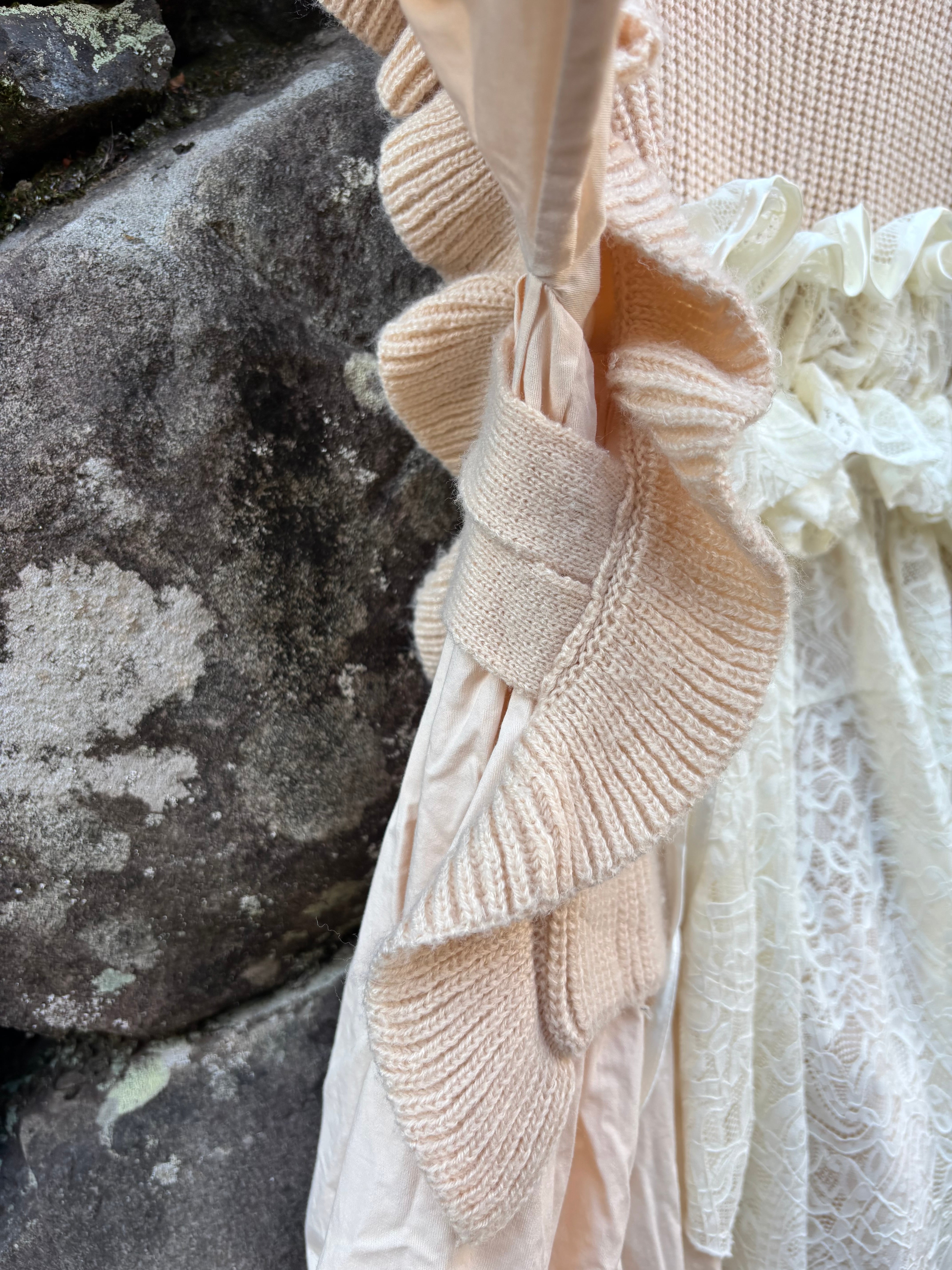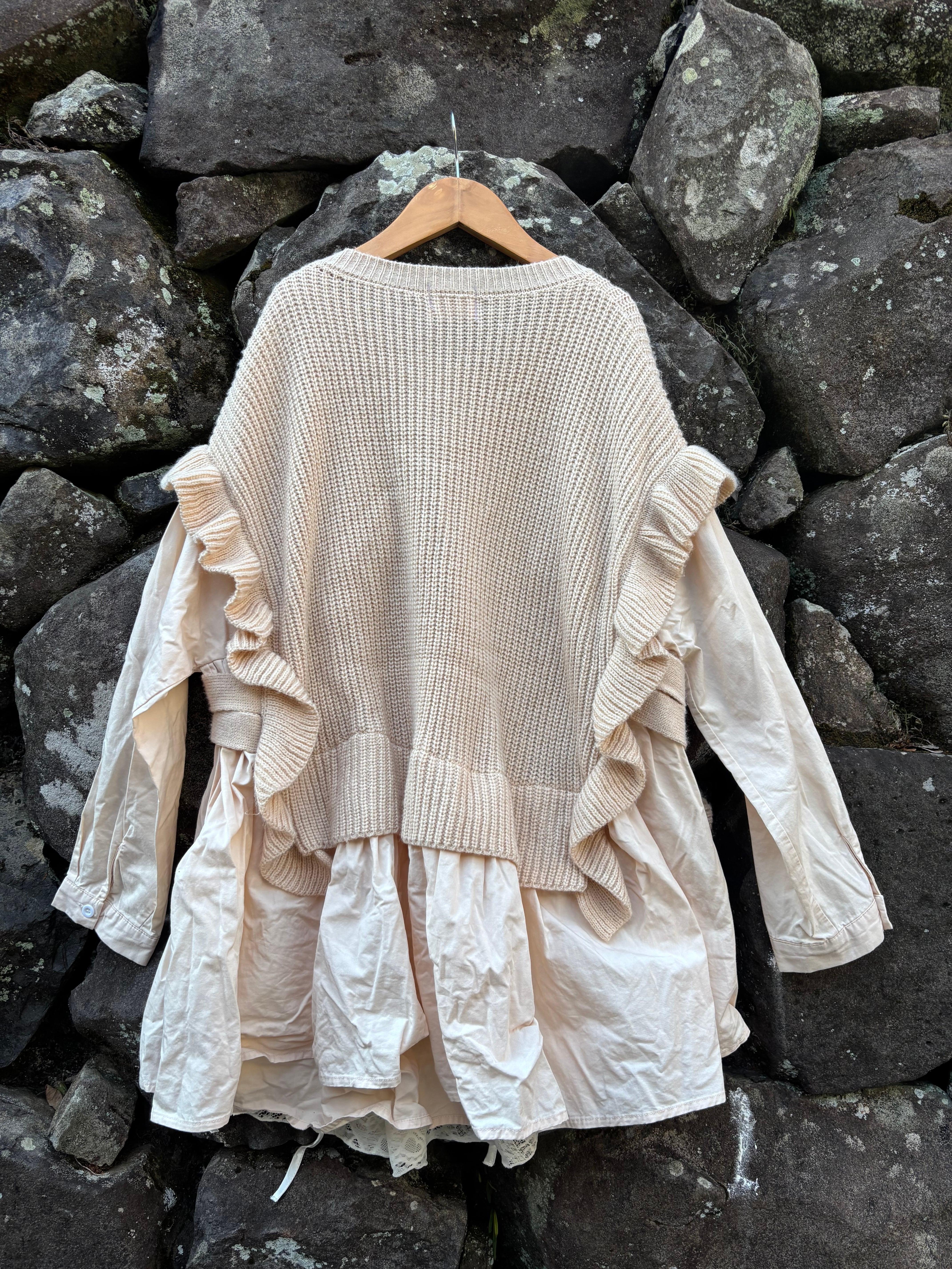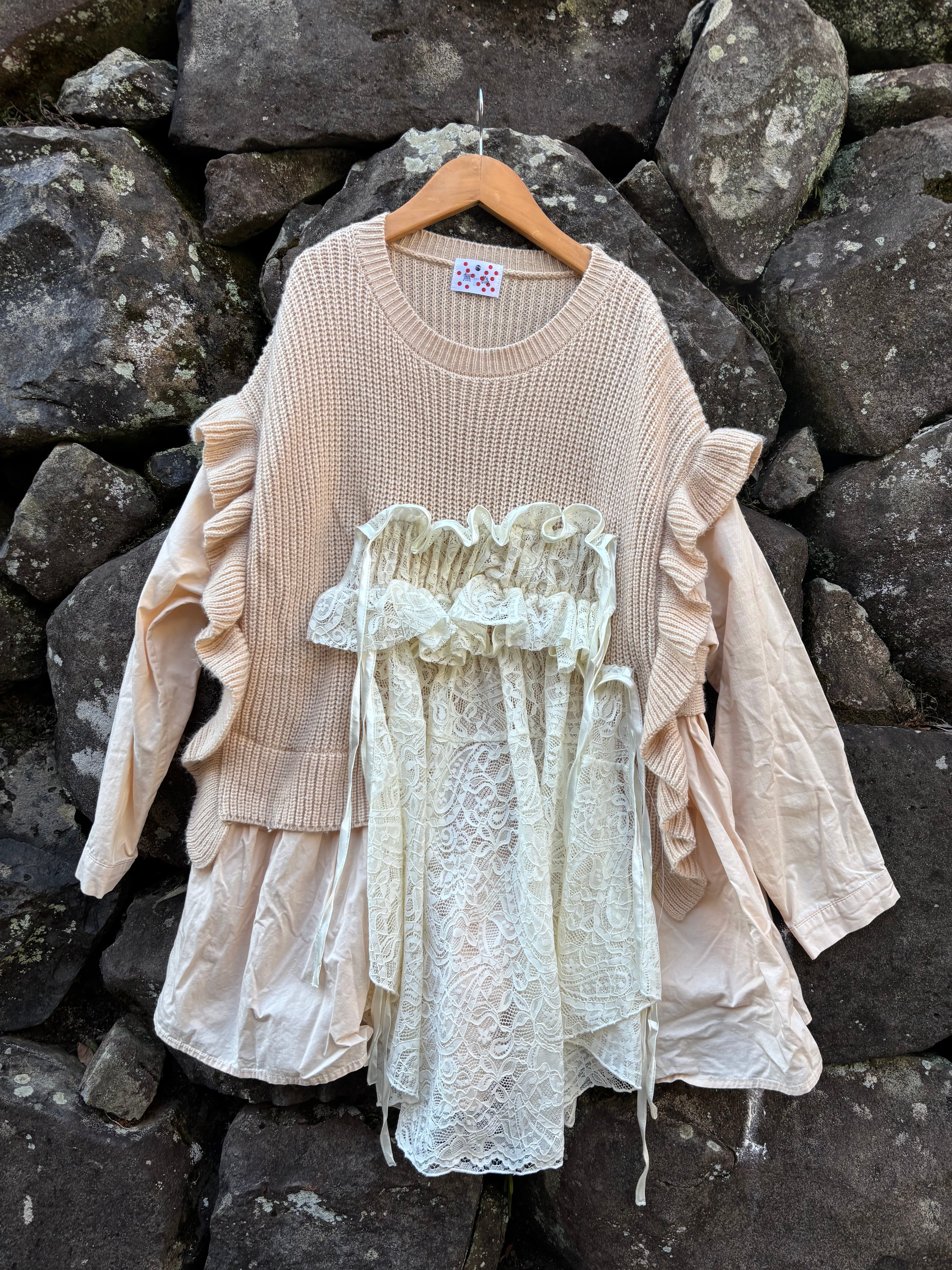 縫い目や境界を隠さない、一点物のニットです。