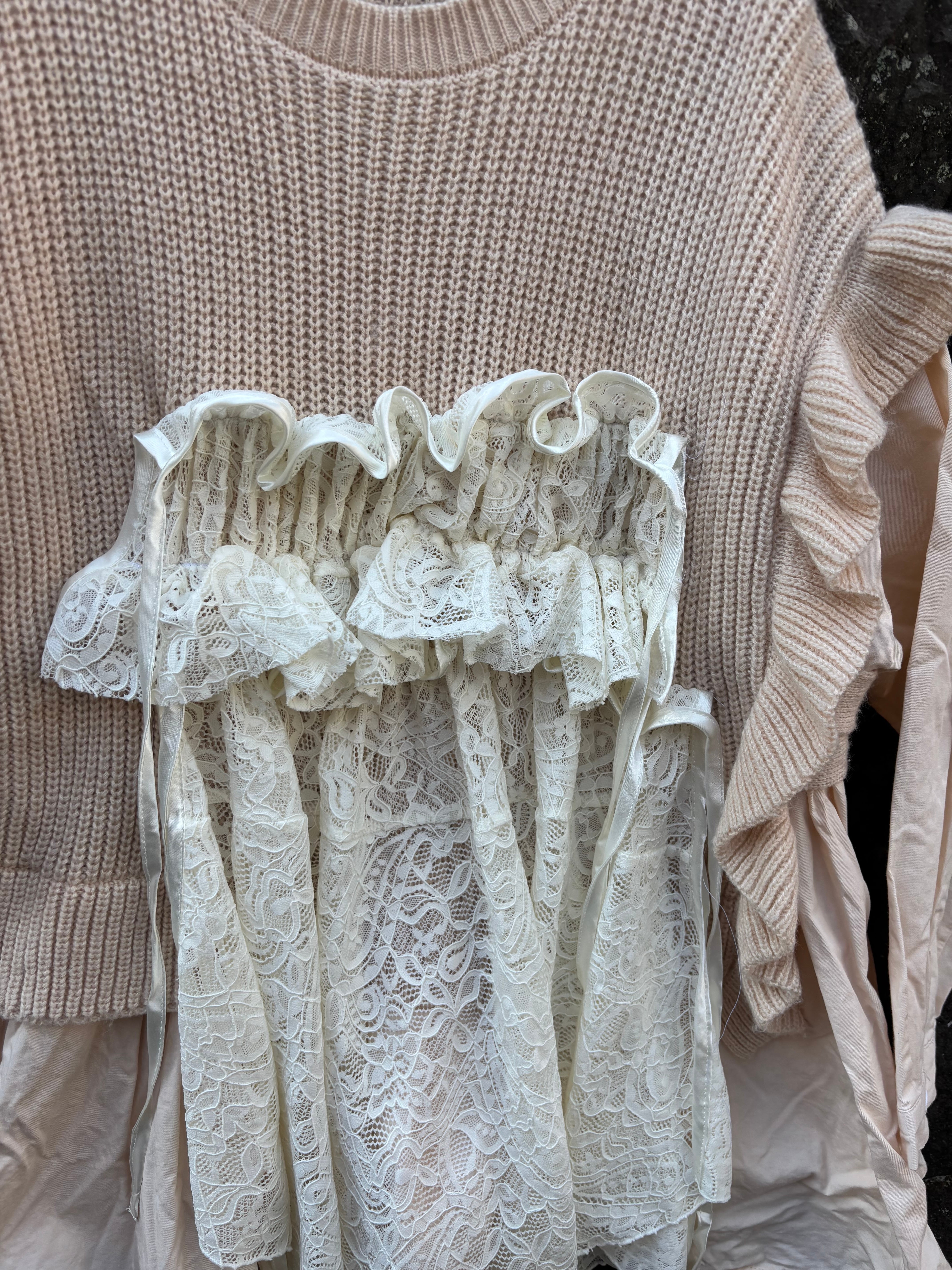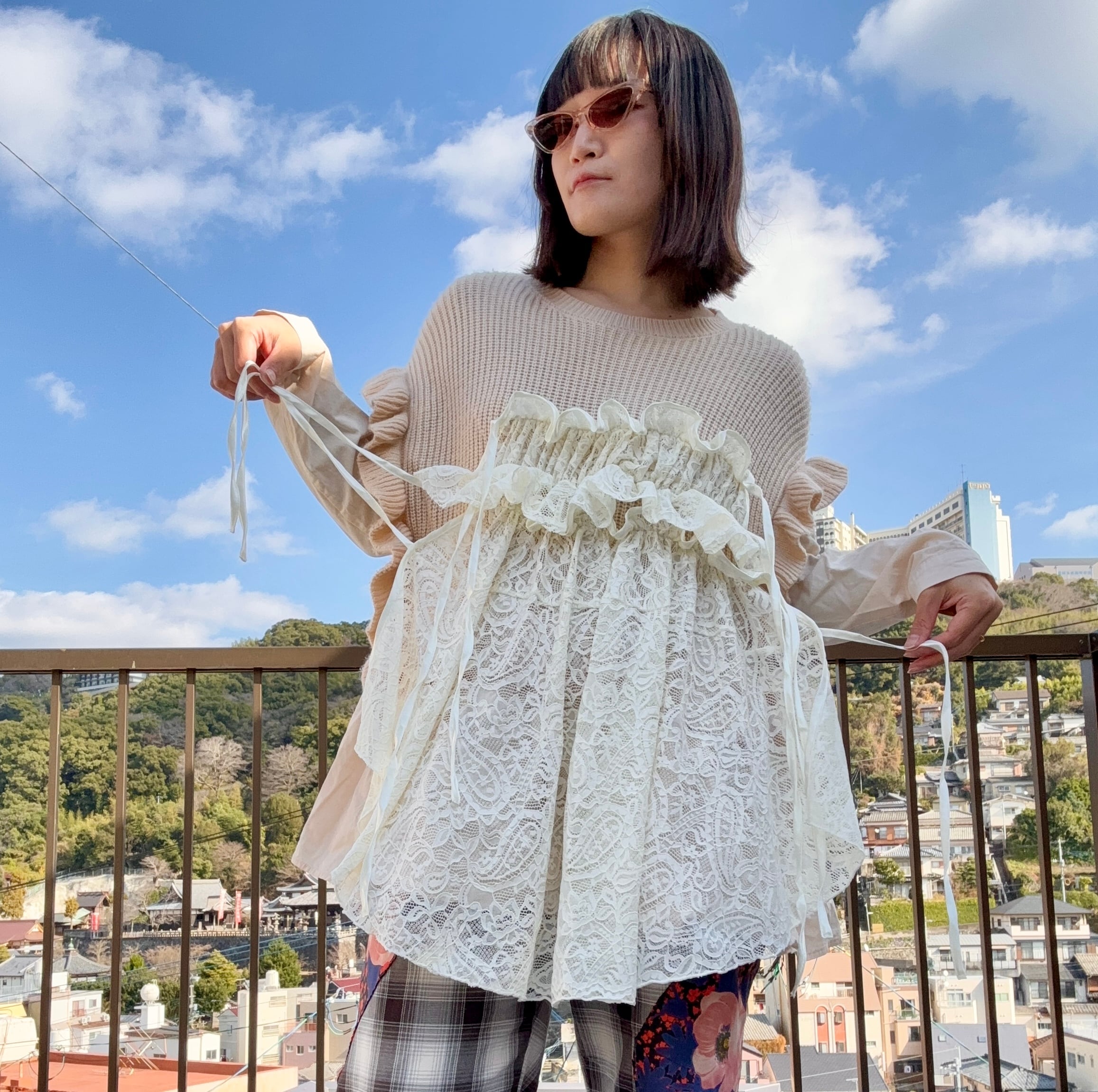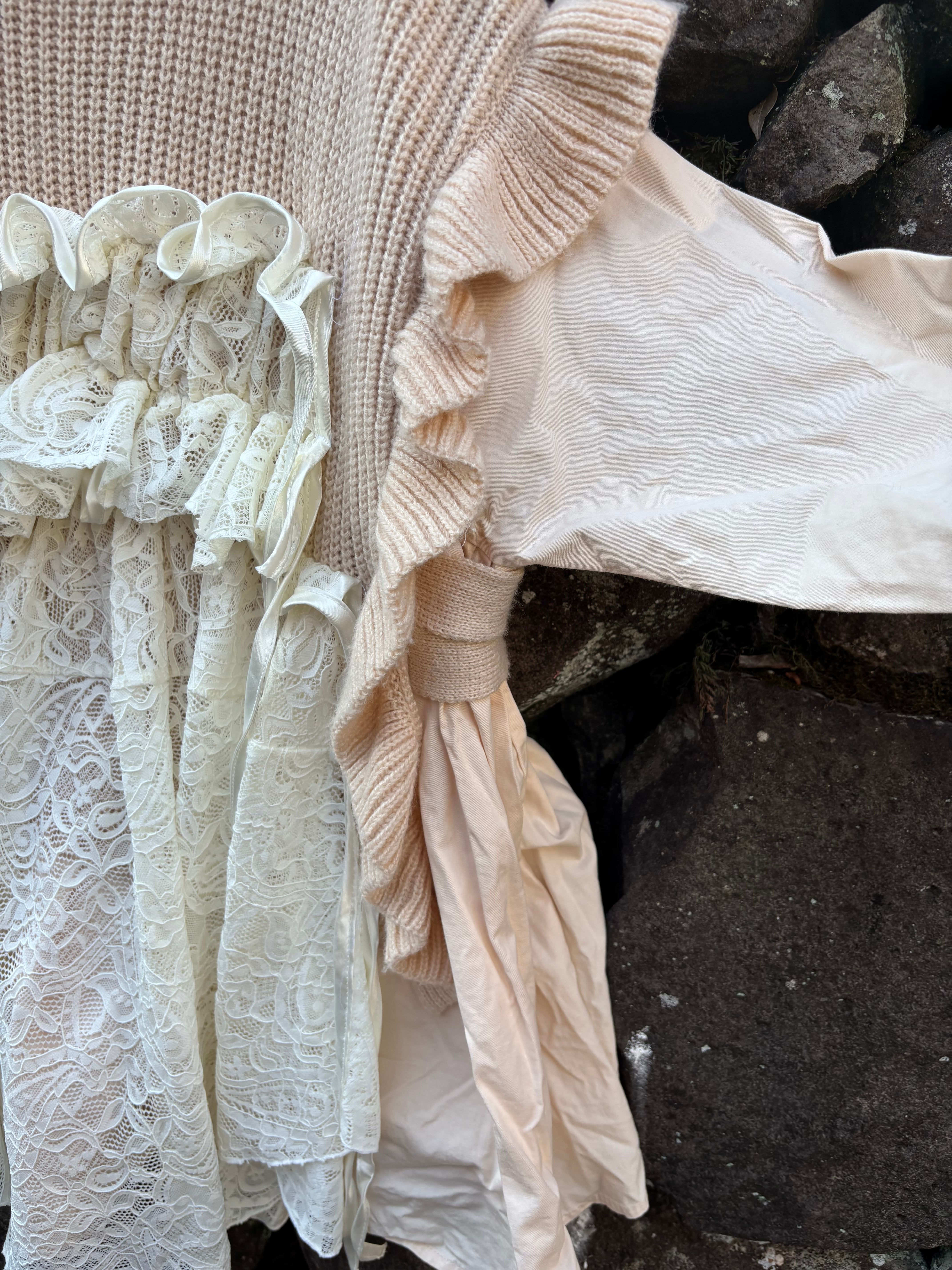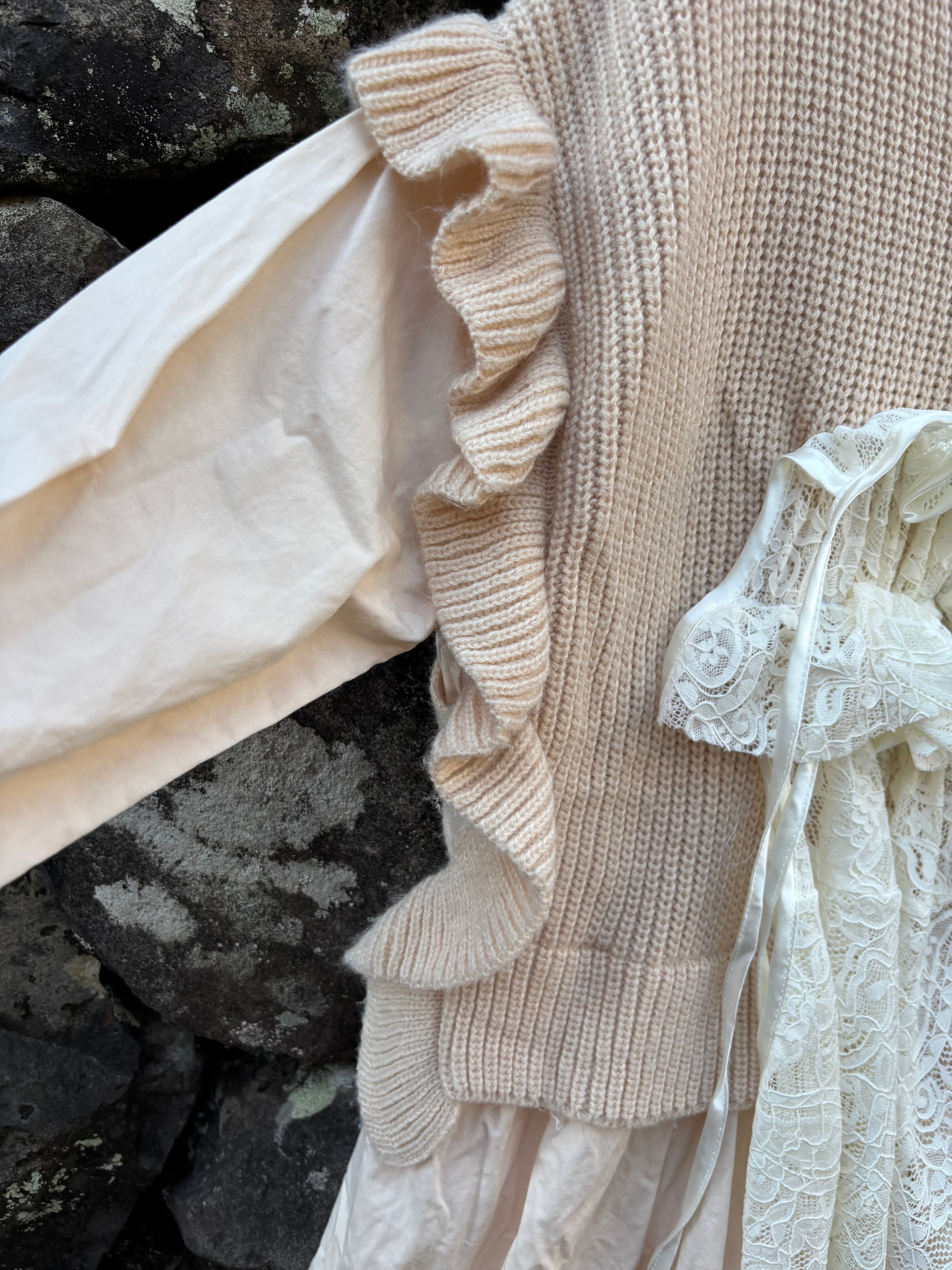 縫い目や境界を隠さない、一点物のニットです。